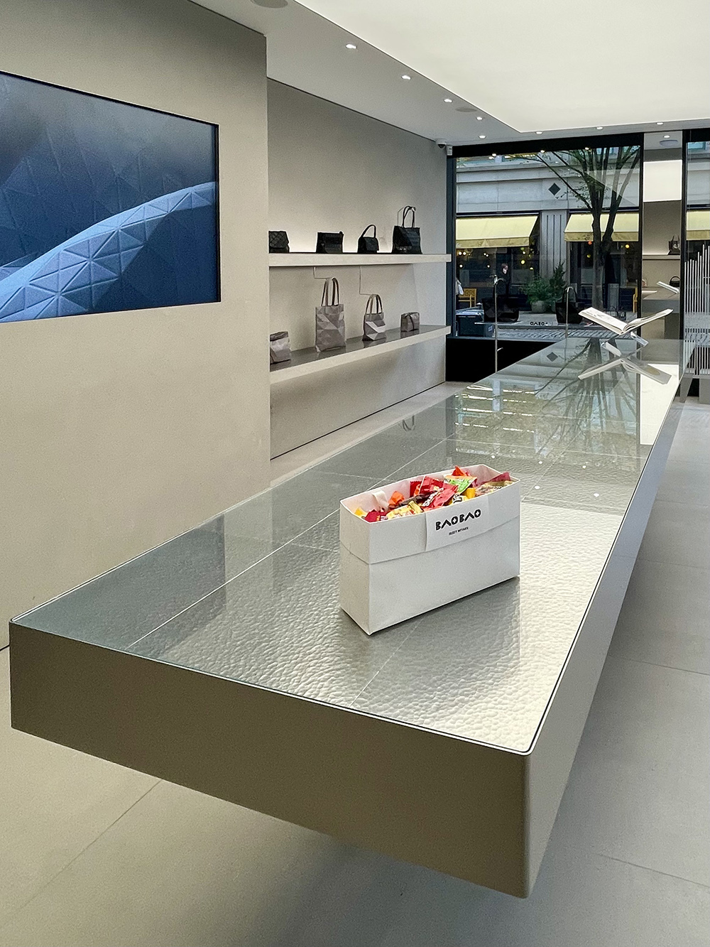 Another addition to SoHo’s roster of new retail experiences is the Bao Bao Issey Miyake boutique at 126 Prince Street. Designed by Japanese studio Moment, the label’s first U.S. flagship was inspired by the traditional Japanese “irori” or sunken hearth, a traditional concept used in Japanese homes. Plaster walls and a centrally positioned hammered aluminum table define a minimalist aesthetic that reflects Bao Bao’s designs.