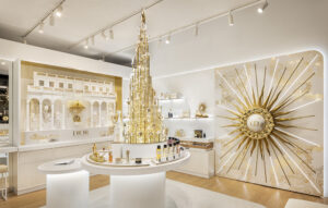 The store is akin to a jewel box, with gold-accented displays set against a white-on-white backdrop. Inside, visitors are drawn to the golden tower (incorporating the brand’s CD logo) mounted on top of the warmly illuminated central fixture table. Here, guests are encouraged to try the showcased fragrances of La Collection Privée.