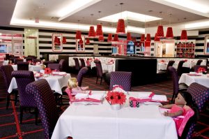 And since the brand expects girls to visit these locations frequently, designers added party rooms where girls can host gatherings with friends and their dolls.