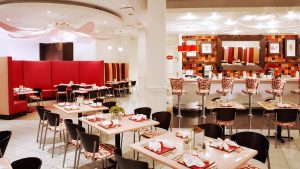 In the restaurant, the flagship’s formal offerings (white tablecloths and all) have been replaced by a bistro setting complete with dessert counter. Large and decidedly girly flower-petal lights hang overhead.