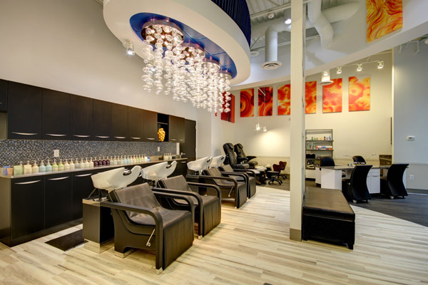 The salon’s wide-open space presented a potential acoustical nightmare for the design team: the constant roar of hair dryers and conversation, which would reverberate if not for a few buffering elements that were specified. Special padding behind the artwork and the gypsum board “clouds” from which the hair dryers hang help to diffuse the din.