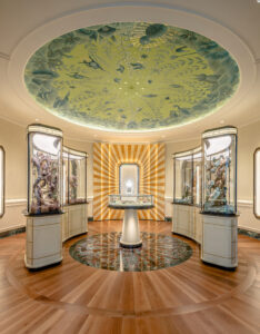 The interior of the 2992-square-foot retail space continues to bridge East and West through design. Art deco motifs and Boucheron’s signature emerald green can be found alongside shades of red, the color of luck in Chinese culture. The flagship’s layout abides by Feng Shui, harmonizing the flow of movement and energy.
