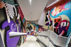 Throughout the store are colorful and edgy murals created by artists local to the city or neighborhood.