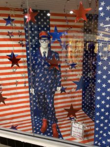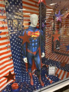 My latest window at The Uptown Mall, in Hot Springs, Ark., celebrates the “stars and stripes” and, yet again, I decided to push the envelope. I used plastic tablecloths with stars and stripes to cover the walls, most of the window and the floor. The male mannequin even wears a star-covered suit with lots of red, white and blue accessories. The title of the window, “Uncle Ham: Super Hero” did not go over well with some veterans, and I was asked to change the title because it was making fun of “Uncle Sam.” Not wanting to offend any veteran, I agreed immediately and made the change to, “Be a Super Hero to Somebody.”