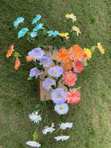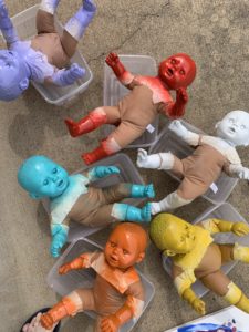 There are six baby mannequins, each a different color, spanning the color wheel. I first wanted them to be all white, but couldn’t find them cheaply, or borrow them. I did find some baby dolls online that had a pink skin option and a brown skin option. The brown skin doll option had a better head shape and proportion, so I went with that. I spray painted one of them white and let it dry. Then I saw the option of using other cans of spray paint colors I already had: Red, orange, yellow, teal and orchid. It is June and Gay Pride Rainbows are everywhere you look, so I went with it.