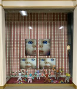Gerber is the perfect word to play on with Gerbera daisies, so I was developing the idea even more, but I had to find them. Luckily, I found white ones here, on sale, and enough to complete the vision. I spray painted them to match each baby and was ready for the install. But the dolls didn’t sit upright with their cloth bodies and I needed a framework to set them in or on. I thought about all the wire lampshades I’ve collected for my flea market booth, and that was the easy fix. I sat each baby inside a lampshade cage, attached the matching colored daisies and completed the install. The photographs of a baby doll’s face on the back wallpapered wall completed the window. (They are from my one man show “Lookin’ Good” from several years ago, of my altered dolls.) I needed a sign and an asterisk to the window, so I put a headless doll crawling under the green curtain wall sticking his butt out toward you, next to the sign. You can’t tell it’s headless, but I know. (By the way: Gerbera daisies technical name is “Transvaal Daisy” so maybe, now you know that reference too.)