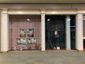 Speaking of subtle, and not so subtle messages, my other window is finally complete in the former Victoria’s Secret storefront (see my last blog for details and images). It’s called “Gerber Daisy Babyland.” It took a while longer to find affordable props and clothing, but I did finally complete my vision. Of course, the irony of a baby display in a lingerie window should not be lost on you, and the other messages should be fairly clear as well.